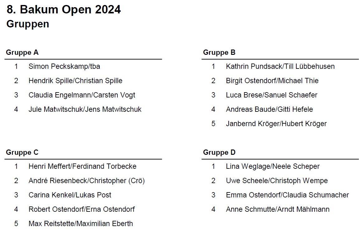 Die 8. Bakum Open sind ausgelost. Das Tableau verspricht Spannung ab dem ersten Ballwechsel. Wir wünschen allen Teilnehmerinnen und Teilnehmern sowie Besucherinnen und Besuchern ganz viel Spaß und ein paar schöne Stunden auf der Anlage. Zur Gruppeneinteilung